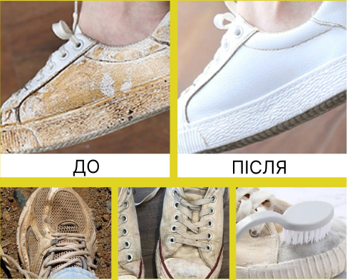 Швидко і якісно очищує навіть найскладніші забруднення — бруд, жир, сліди від резини, повертає взуттю первісний вигляд.